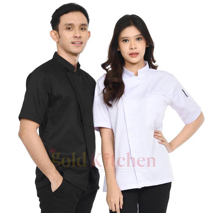 BAJU CHEF BAJU KOKI CHEF JACKET PRIA WANITA LENGAN PENDEK MODEL KOREAN SERIES B WARNA HITAM PUTIH SAFETY BORDIR MERAH WEARPACK TOPI PANJANG - FULL BLACK, S
