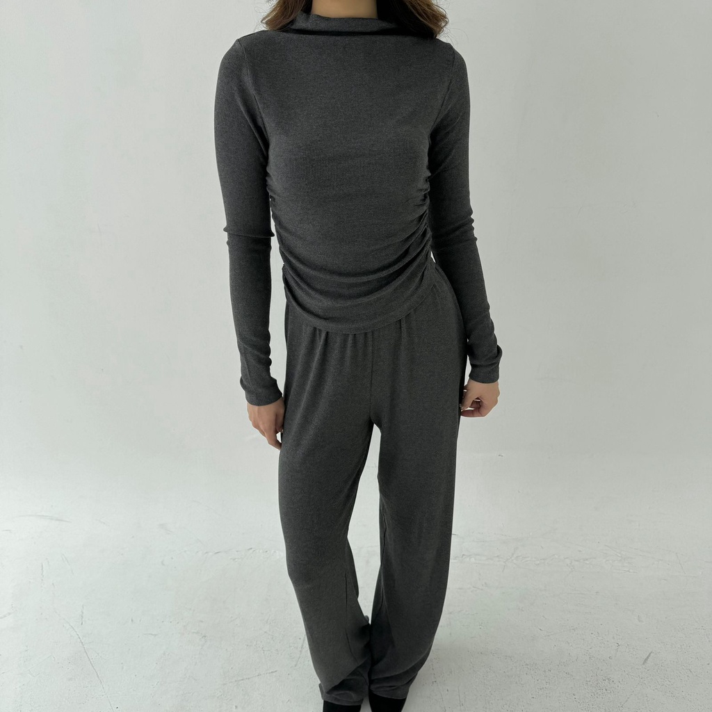 Setelan Wanita Ribbed Knit Set Lengan Panjang Celana Panjang Straight Highwaist Highwaisted Pants