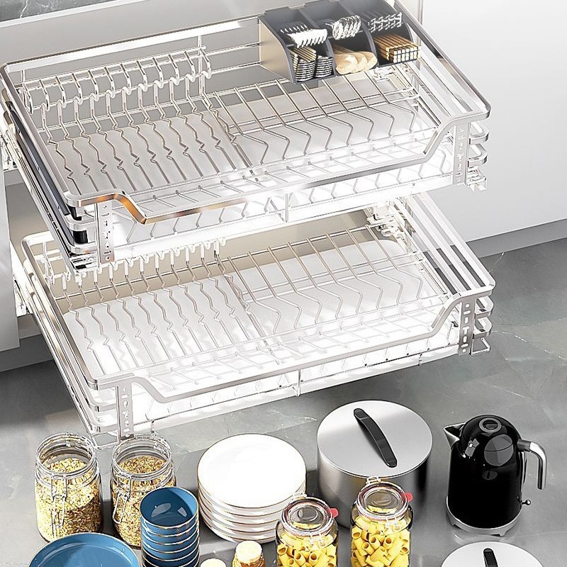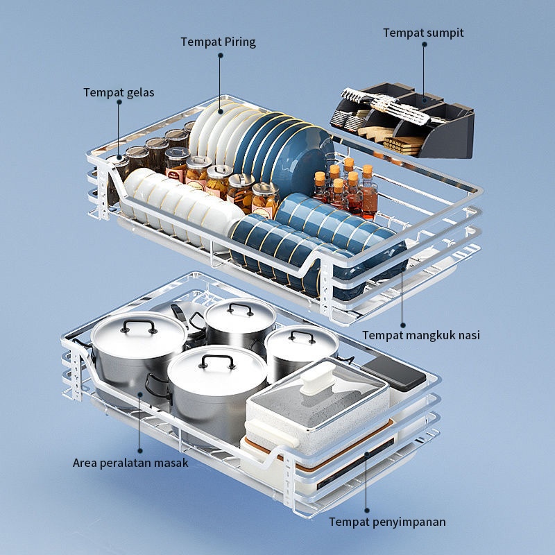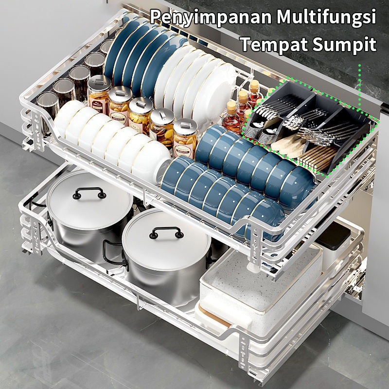 2 Susun Rak Pengering Piring Lemari Dapur Multifungsi Keranjang Geser Laci Rak Tarik Rak Piring Stainless Steel