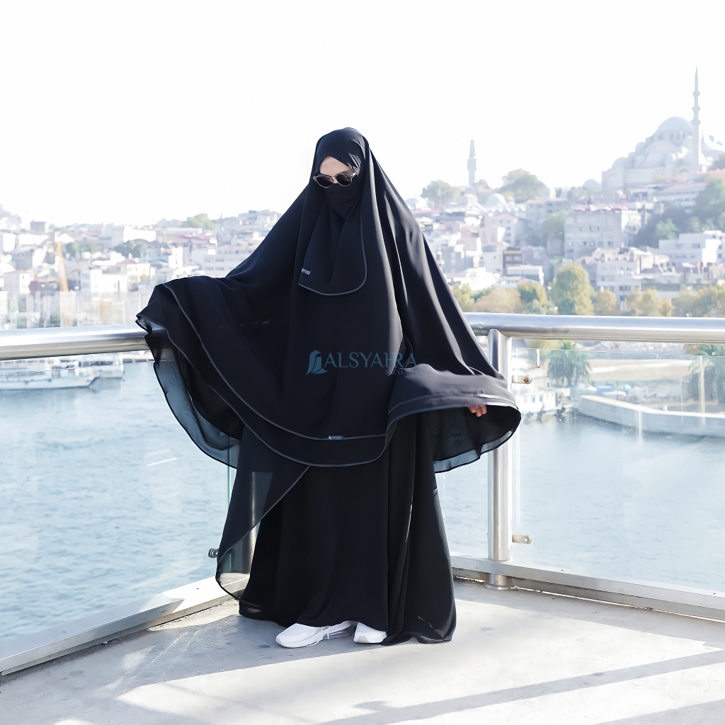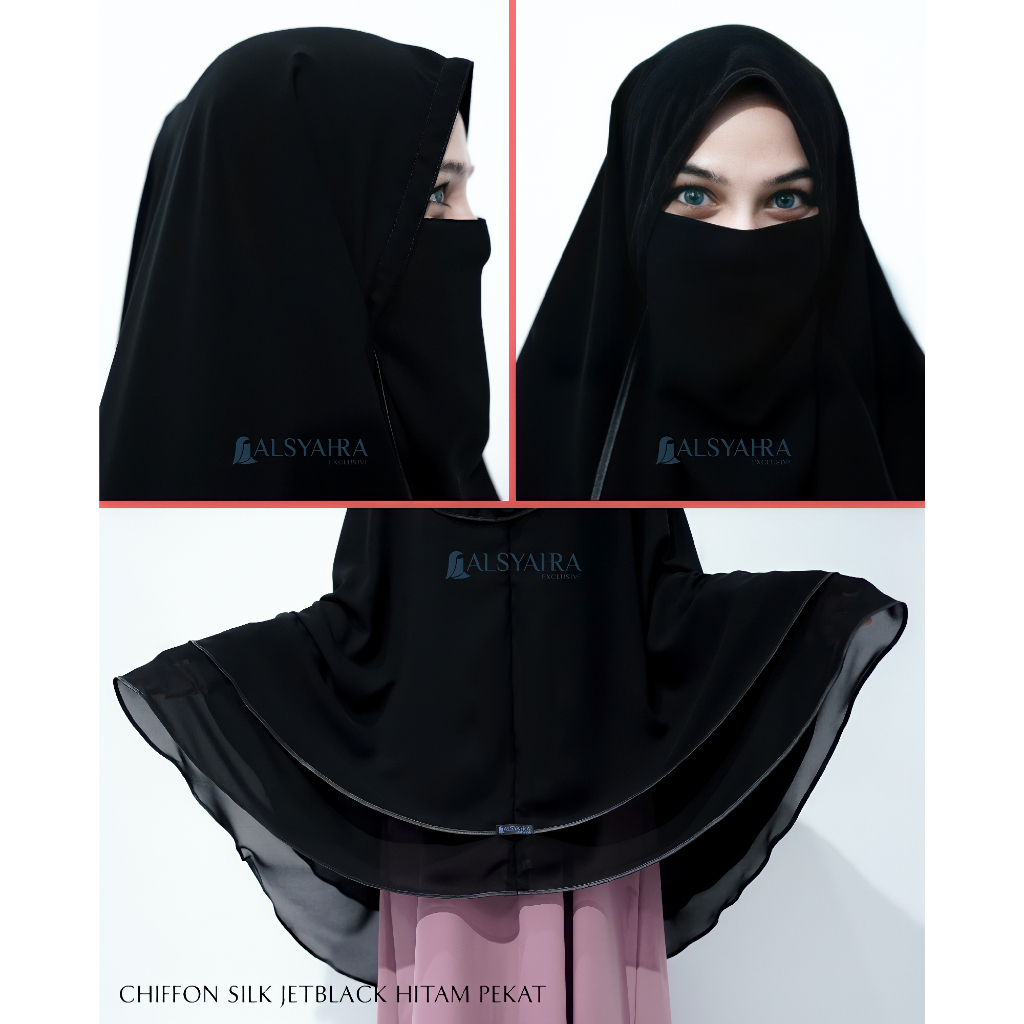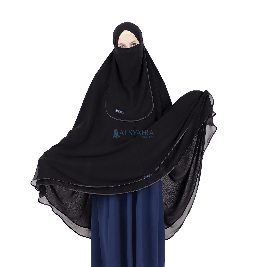 Set khimar syari butterfly 2 layer cadar tali sifon silk jetblack xxl ALSYAHRA EXCLUSIVE bahan tebal
