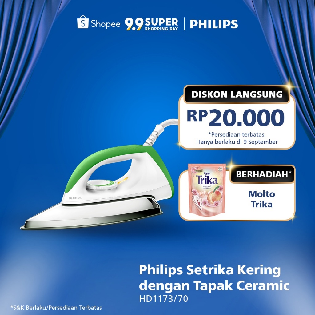 Philips Setrika kering HD1173/70 Hijau, Ceramic 4 Lapis, Anti-Lengket, seterika philips,gosokan baju