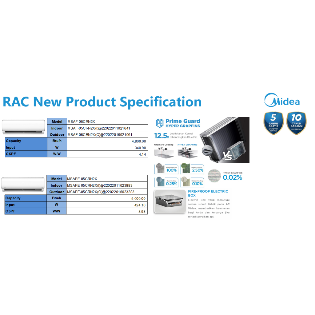 MIDEA ac split 1/2 PK Deluxe HyperGrapfins MSAF / MSAFE -05CRN2 0.5 PK + Pasang