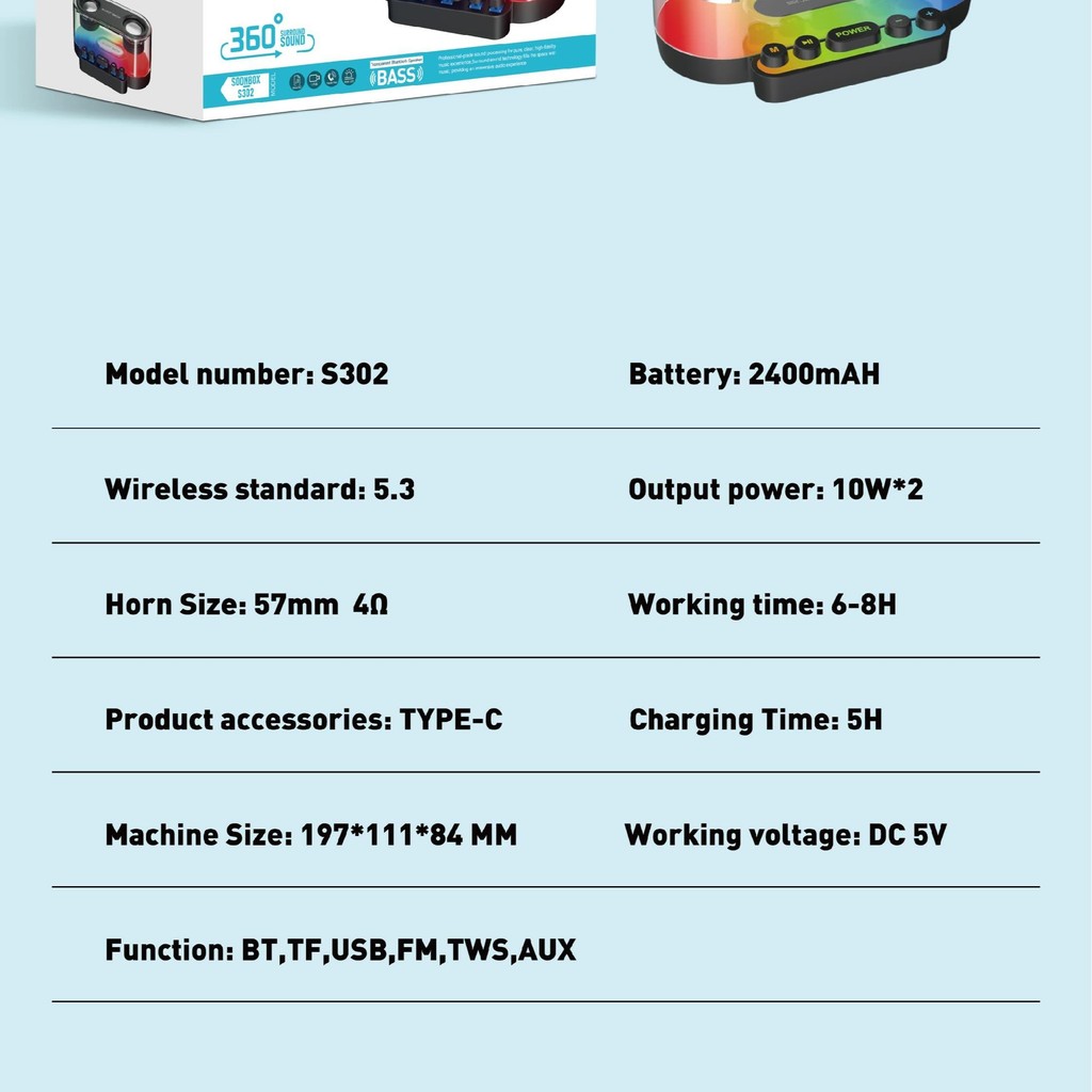 TDT - SOONBOX Speaker Bluetooth 5.3 Wireless 20W 360 Sound S302 With RGB Lights Original Mechanical Button