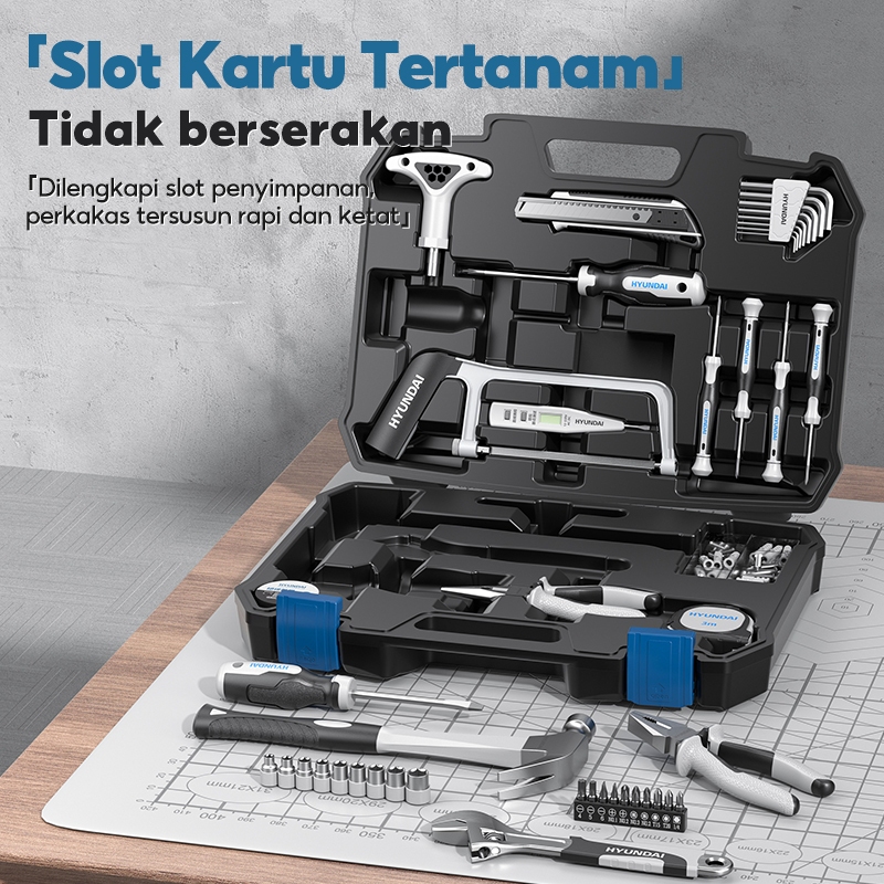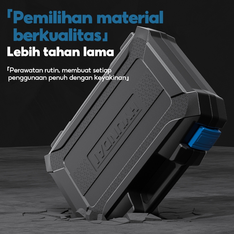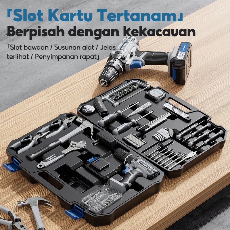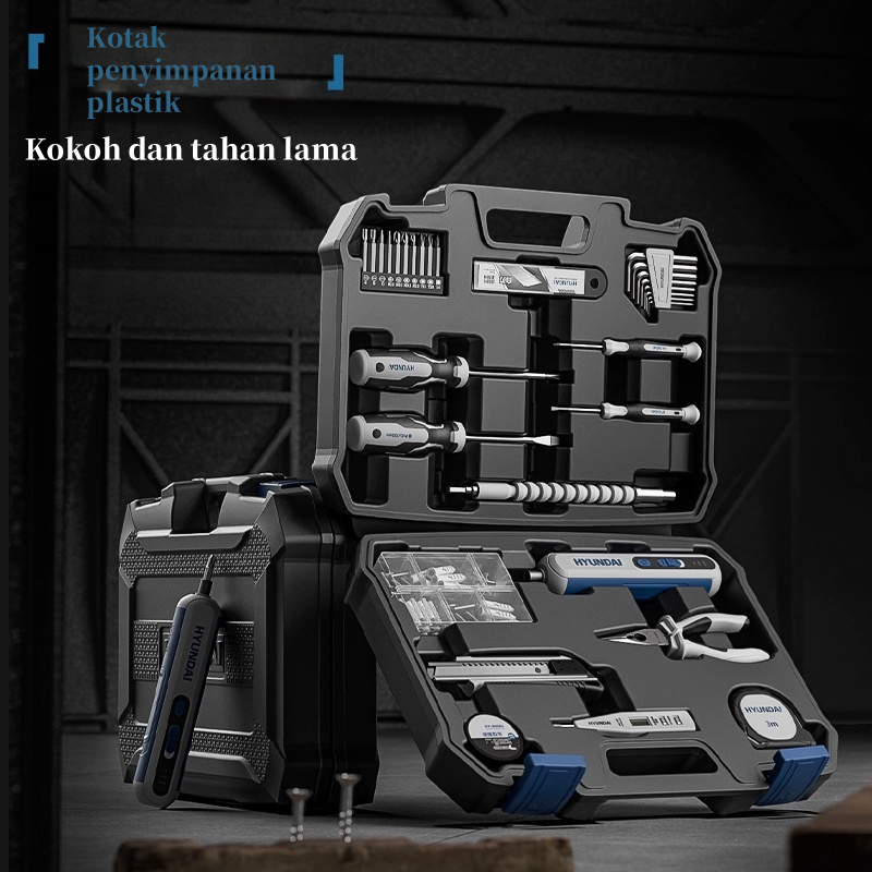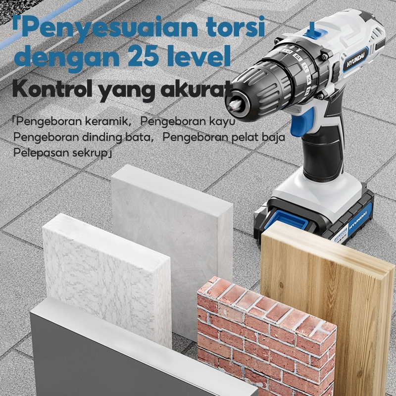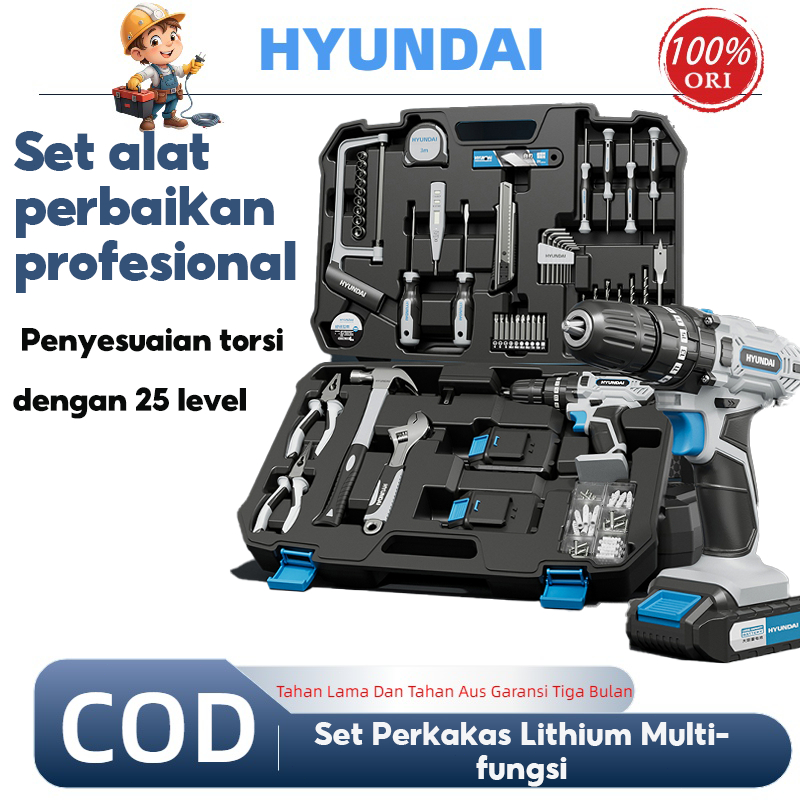 HYUNDAI Mesin Bor Listrik 21V Set Lengkap Baterai Cordless Alat Tukang Obeng Palu Pita Pengukur