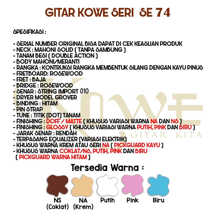 Kowe Gitar Akustik Elektrik ORIGINAL Body Coak Standar Tipe SE 74 NS/NA