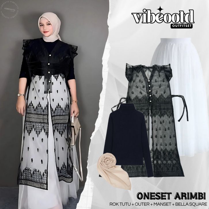 OUTFIT SET WANITA HIJAB ( ROK TUTU PUTIH + OUTER BROKAT LONG ETNIK + INNER MANSET + BELLA SQUARE ) ONE SET KONDANGAN SIM