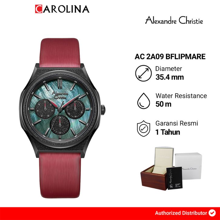 Jam Tangan Wanita Alexandre Christie Multifunction AC 2A09 BFLIPMARE Green MOP Dial Red Leather Strap