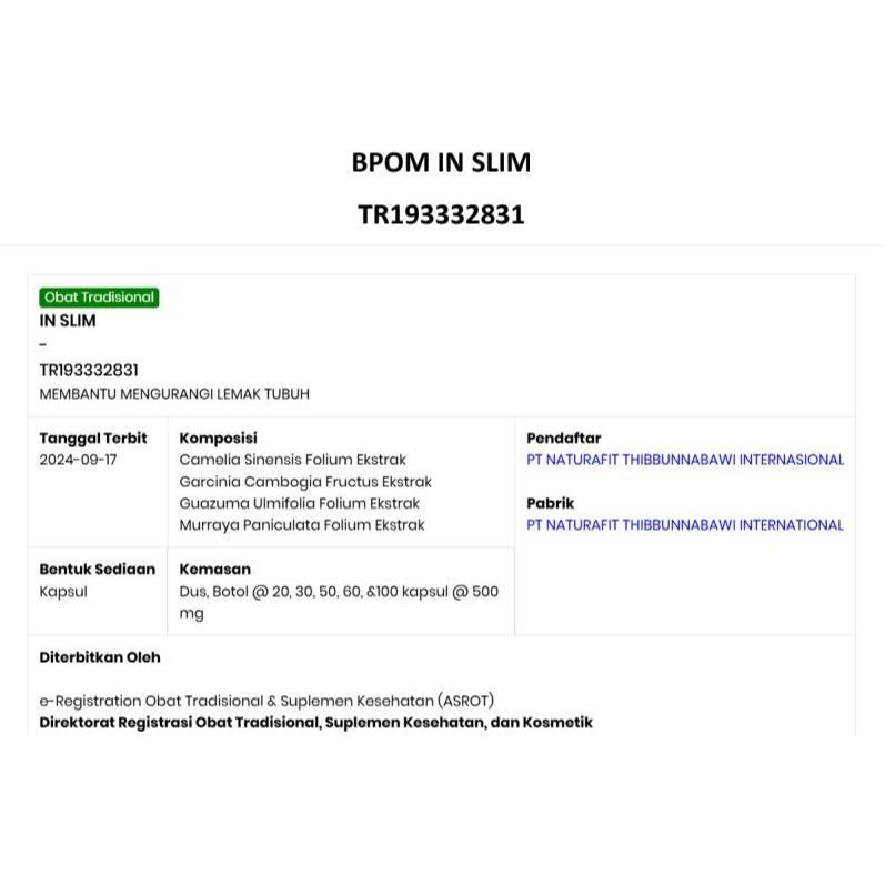Obat diet pelangsing dan penurun berat badan IN SLIM herbal alami 45 kapsul halal sudah bpom