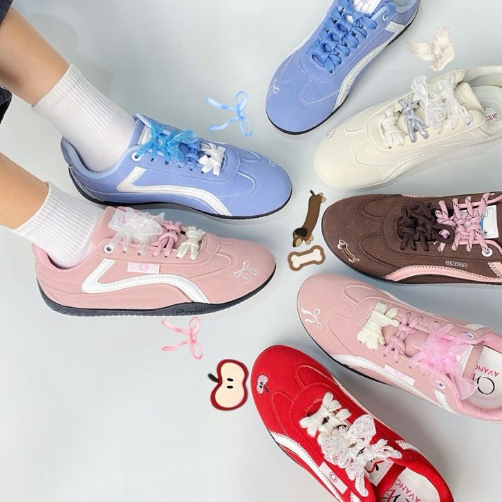 AVANCEID BALLERIES Sepatu Sneakers Wanita Casual Sepatu Outdoor Fashion Pink Coquette Ribbon Silver