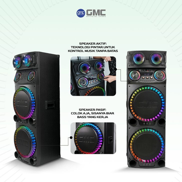 GMC Speaker 882E – Professional Line Bluetooth Karaoke Speaker 4x12” – 500W, 2 UHF Wireless Mic, LED