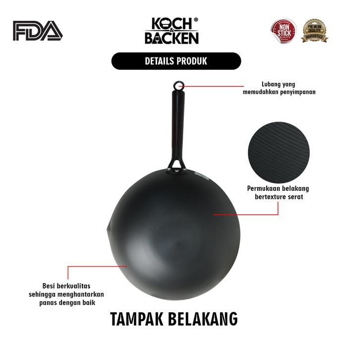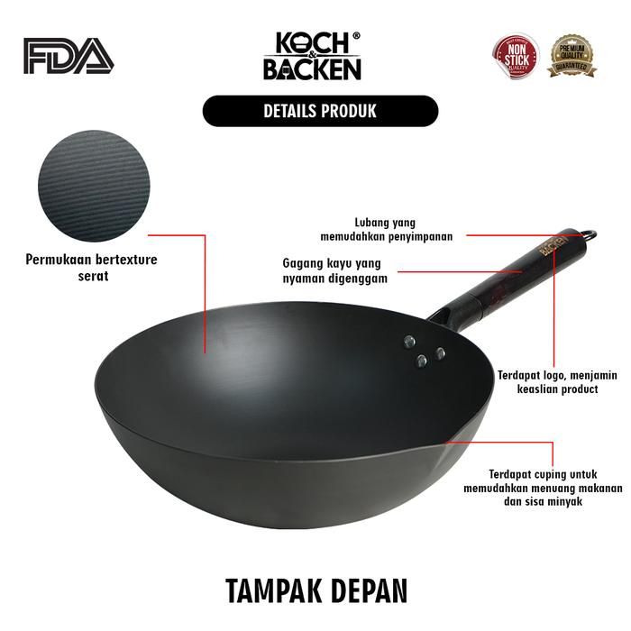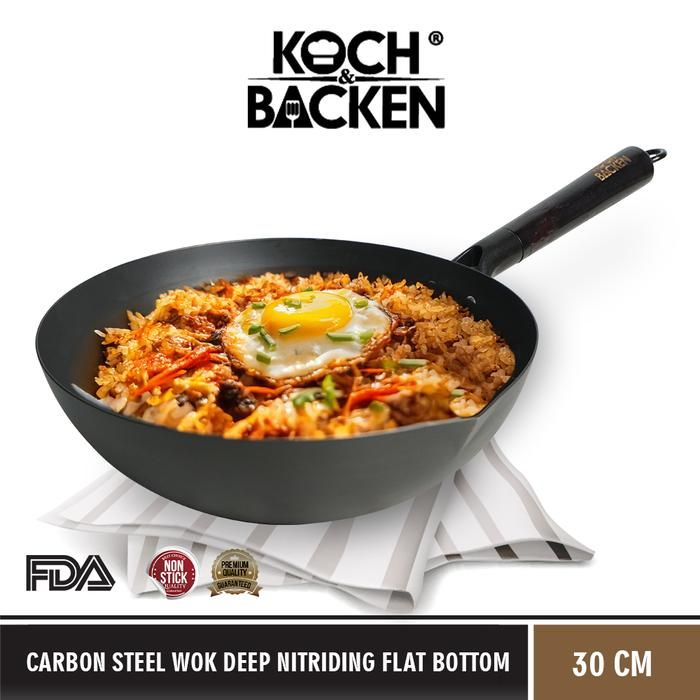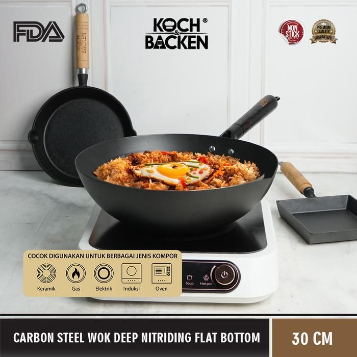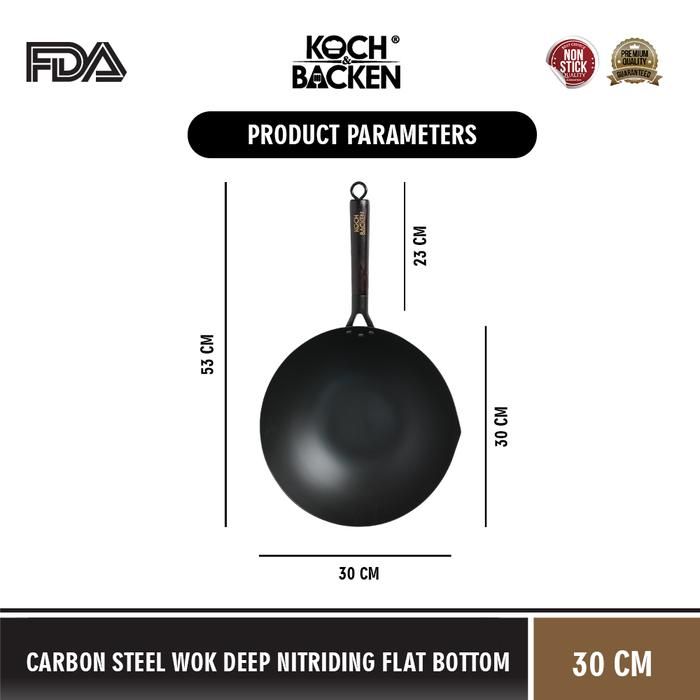 Wajan KOCH&BACKEN Carbon Steel Wok Deep Nitriding Flat Bottom 30cm with Wooden Handle - Panci Wajan