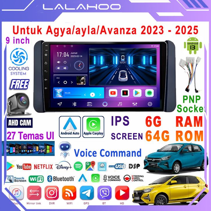 Head Unit 9 inch Android 13 - 6GB+64GB Termasuk Kamera Mundur & Kipas Support Carplay Agya/Ayla/Avanza/Xenia 2023-2025.