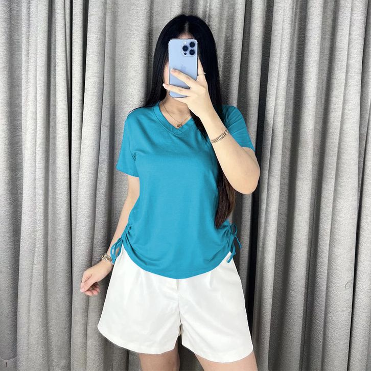 Atasan Wanita Serut Samping Leher V Kaos Wanita Lengan Pendek V Neck 8015