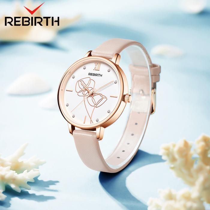 REBIRTH Jam Tangan Wanita Tali Kulit Anggun Bisnis Display Kuarsa - Pink Flower