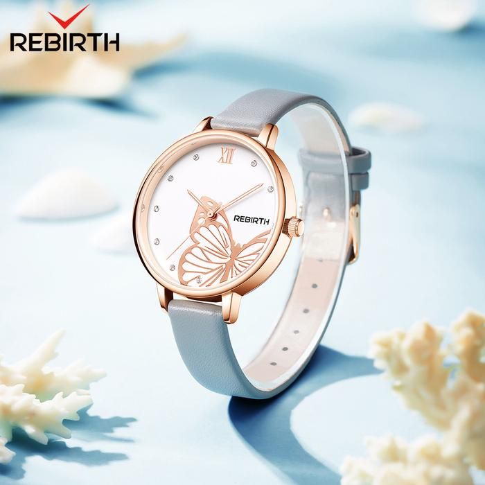 REBIRTH Jam Tangan Wanita Tali Kulit Anggun Bisnis Display Kuarsa - Grey Butterfly