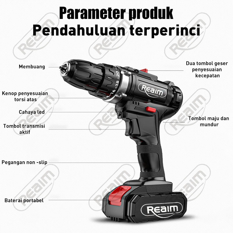 Reaim Bor baterai 10MM Bor Listrik Mesin Bor Bor Impact Impact Baterai Bor listrik Set Lengkap Bor Cordless