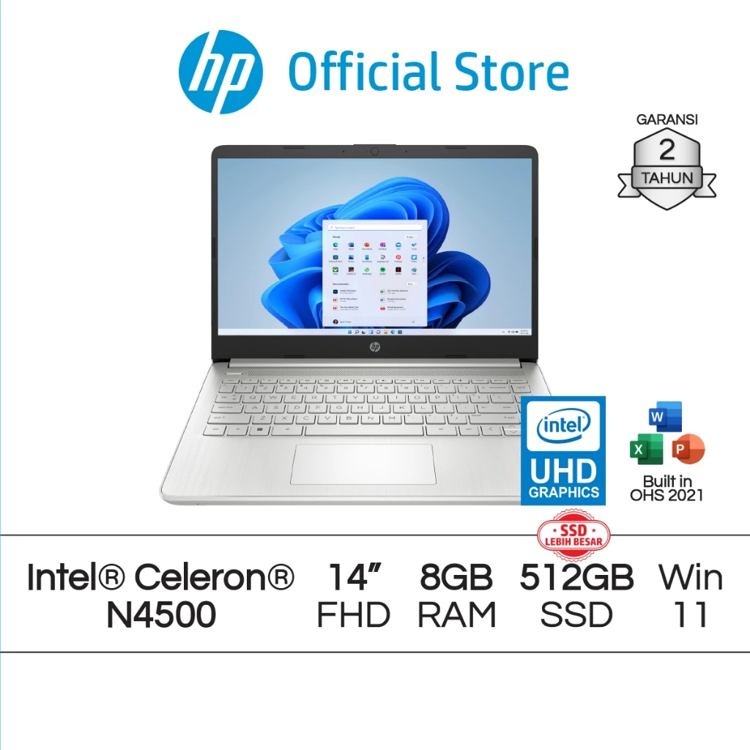 Laptop HP Intel Celeron N4500 UHD 4GB RAM/512RB SSD Silver Windows 11 Garansi Resmi 2 Tahun