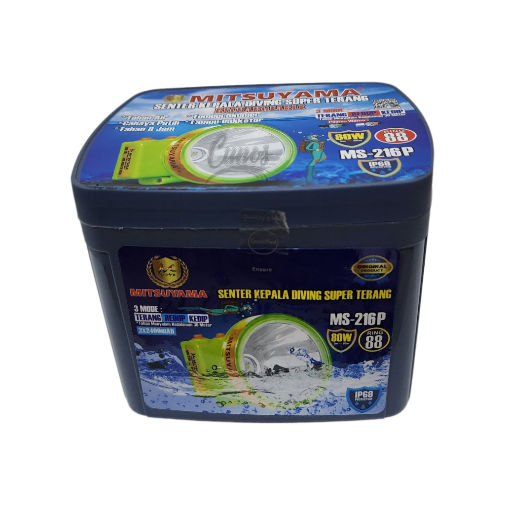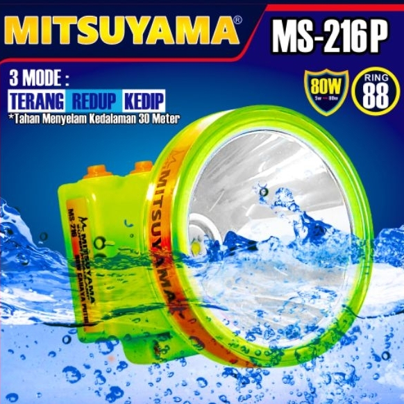 Senter Kepala Selam Diving 80 Watt Mitsuyama MS-216P/MS-216K Cahaya Putih & Kuning Waterproof Super Terang Batre 4800mAh Tahan Hingga 20 Jam Pemakaian
