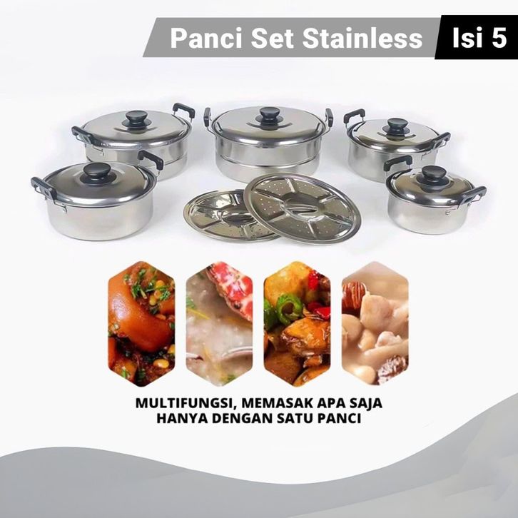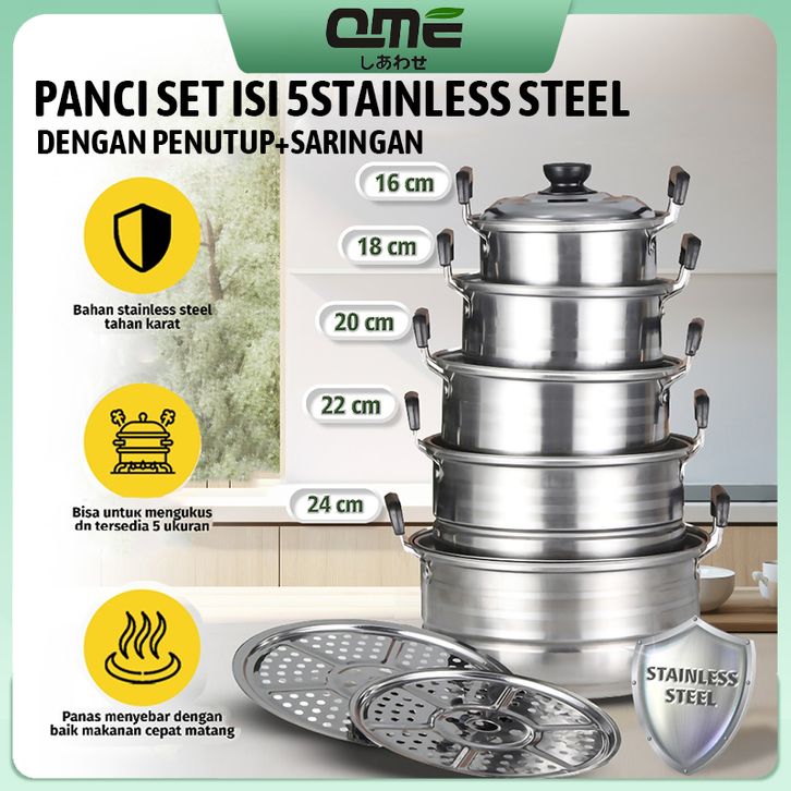TERBARU QME 12in1 Panci Steamer Set Stainless isi 5 pcs + 2pcs Kukusan Panci Bahan Tebal PREMIUM/Panci Stainless