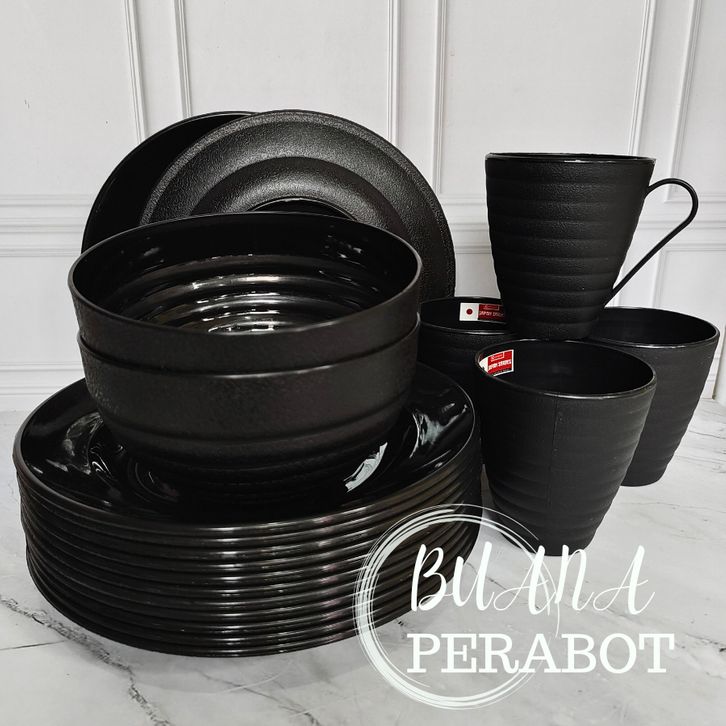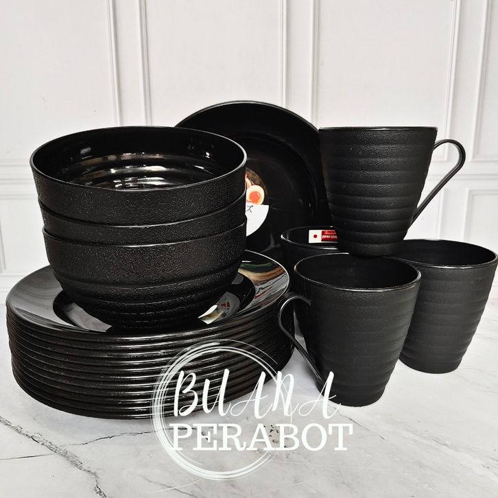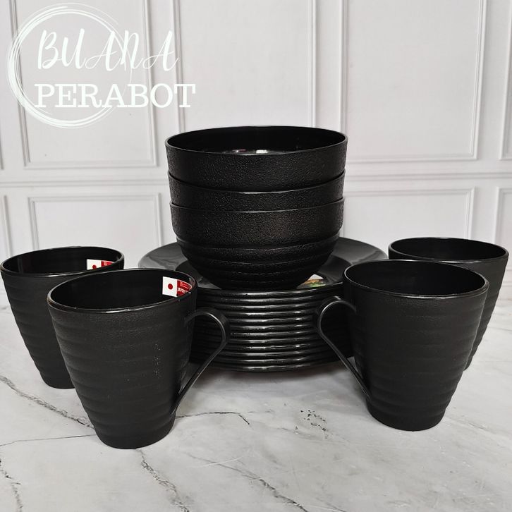 NEW PROMO SET KOMPLIT RAMEN HITAM POLOS ISI 12 PCS CAMPUR PIRING MANGKUK DAN CANGKIR MINUM PLASTIK TEBAL PREMIUM