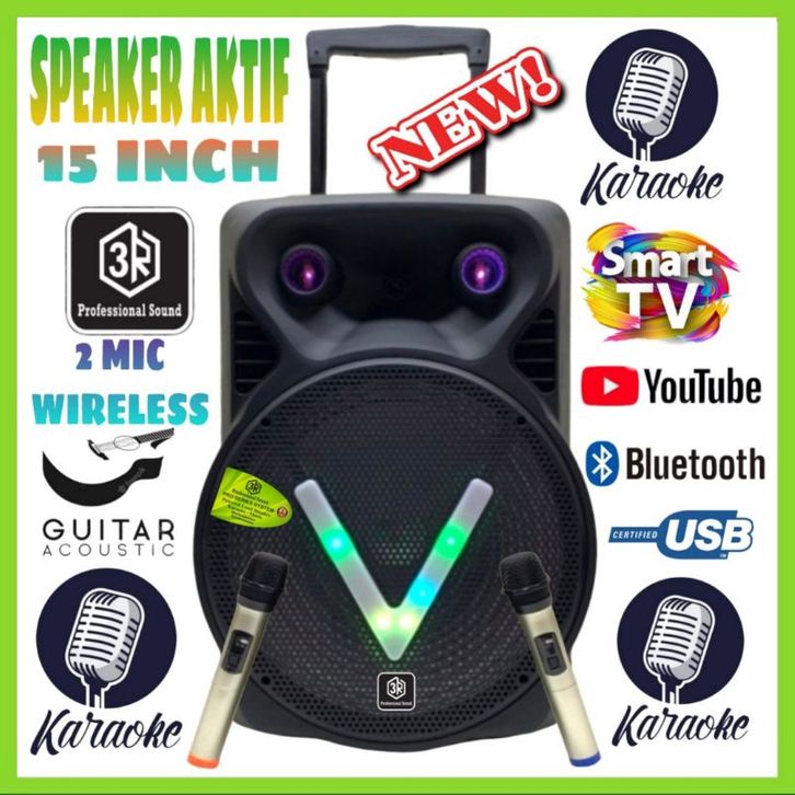 Speaker Portable 3R 15 Inch 2 Mic Wireless Karaoke Di Smart Tv Youtube DJ 1588