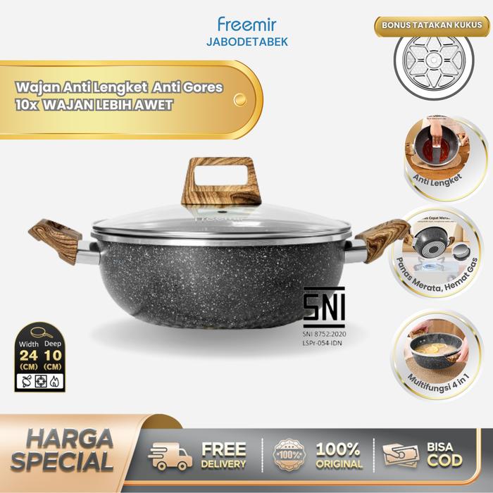 MALL DAY READY freemir Wajan Anti Lengket 24 cm BONUS PLAT KUKUS Wok Pan Plus Tutup Kaca PFOA Free