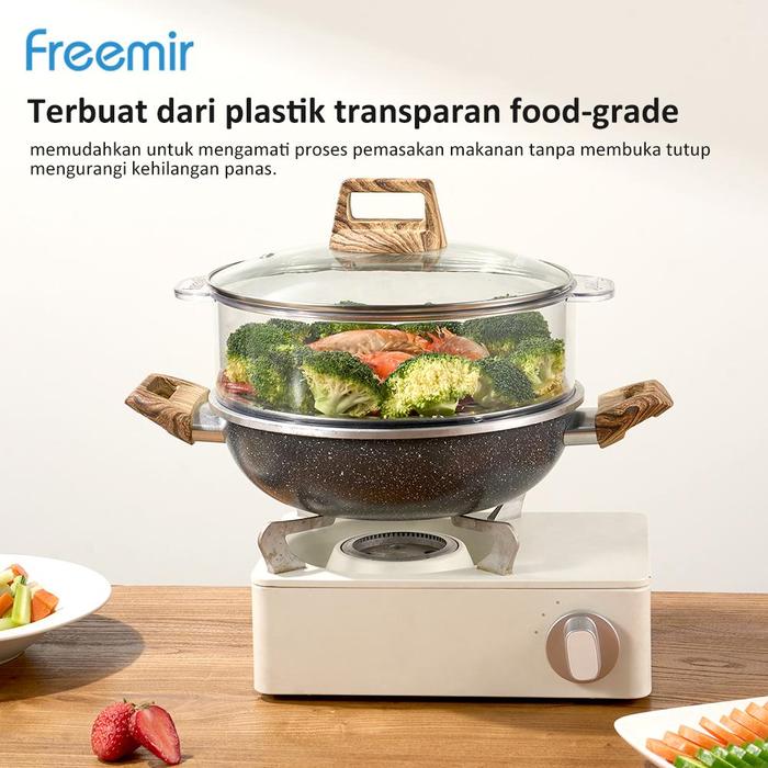 BRAND freemir Wajan 24 cm Hitam Lebih Tinggi dengan Kukusan Tranparan/Stainless Steel Penggorengan