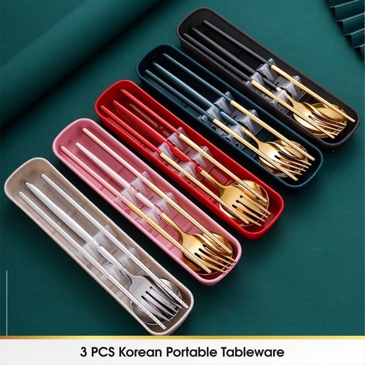 TERLARIS SET 3 IN 1 ALAT MAKAN KOREA PORTABLE BAHAN STAINLESS STEEL ( SENDOK - GARPU - SUMPIT ) enelc