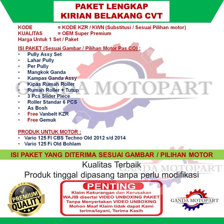 PAKET LENGKAP KIRIAN CVT VARIO 125 FI CBS TECHNO OLD BOHLAM 2012 2013 2014 KZR KWN K35