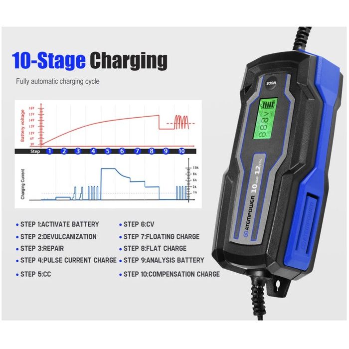Smart Battery Charger 12V 10A Trickle Automatic AGM GEL LIFEPO4