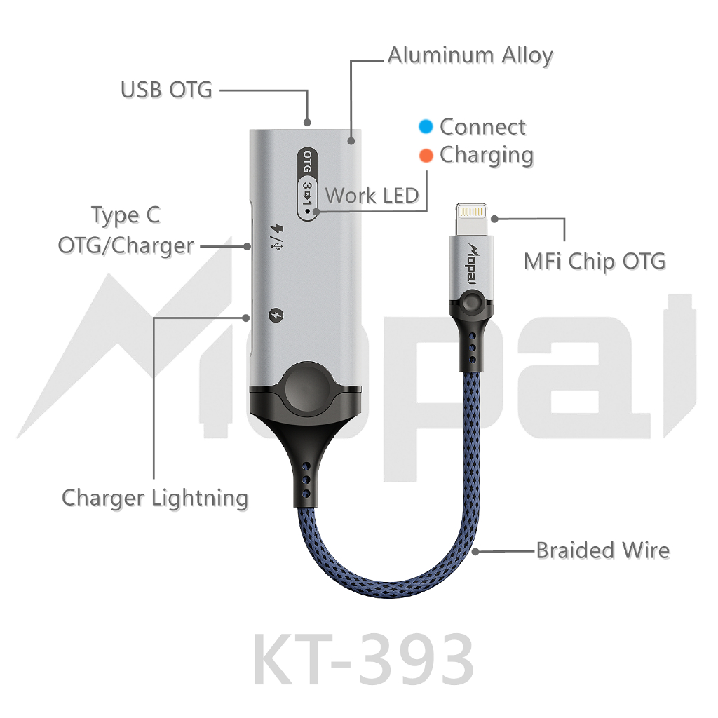 MOPAI - KT393 Splitter OTG iPhone MFI LIGHTNING to USB 3.0 & TYPE C Support Soundcard Live data Game iPad