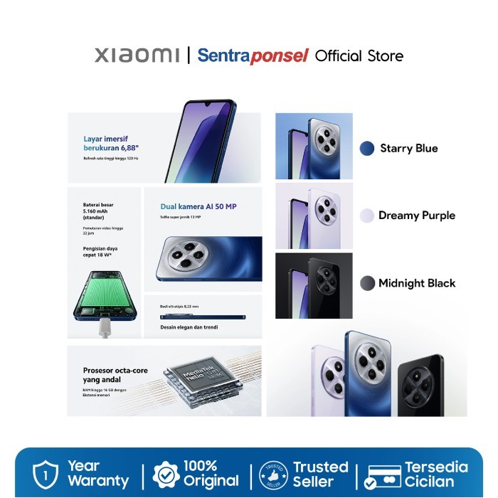 [Star] Xiaomi Redmi 14C 8/256 GB 6/128 GB NFC 50 MP dual kamera AI | Baterai 5.160 mAh - Garansi Resmi - Black, 6GB/12