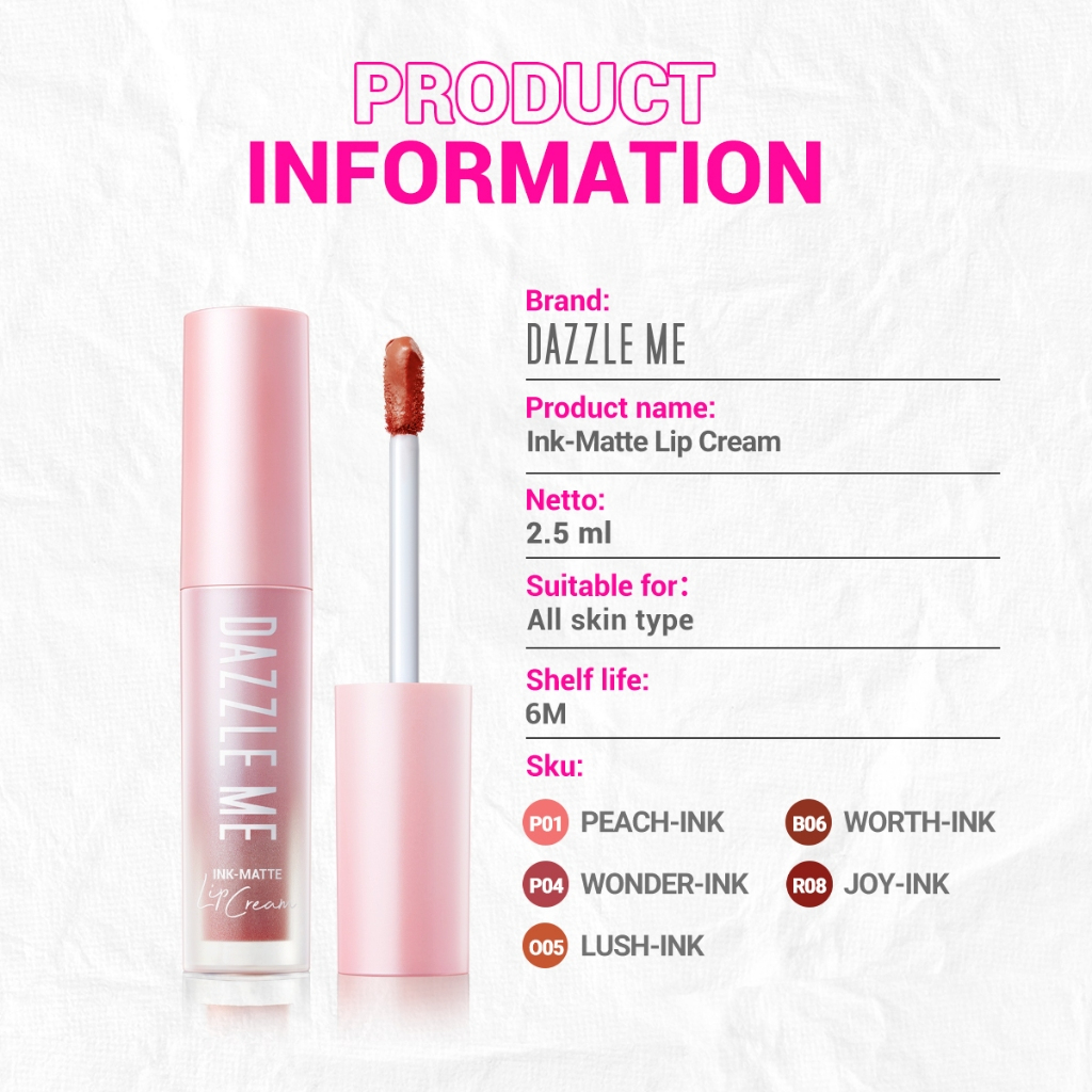 DAZZLE ME Ink-Matte Lip Cream High Pigmented dengan hasil akhir Matte Finish Transferproof Waterproof Tahan Lama 12 Jam
