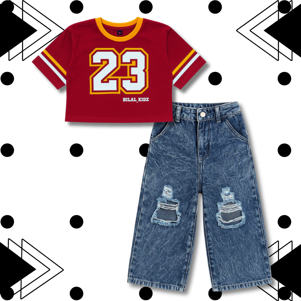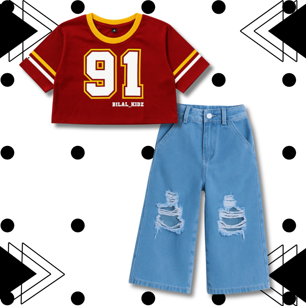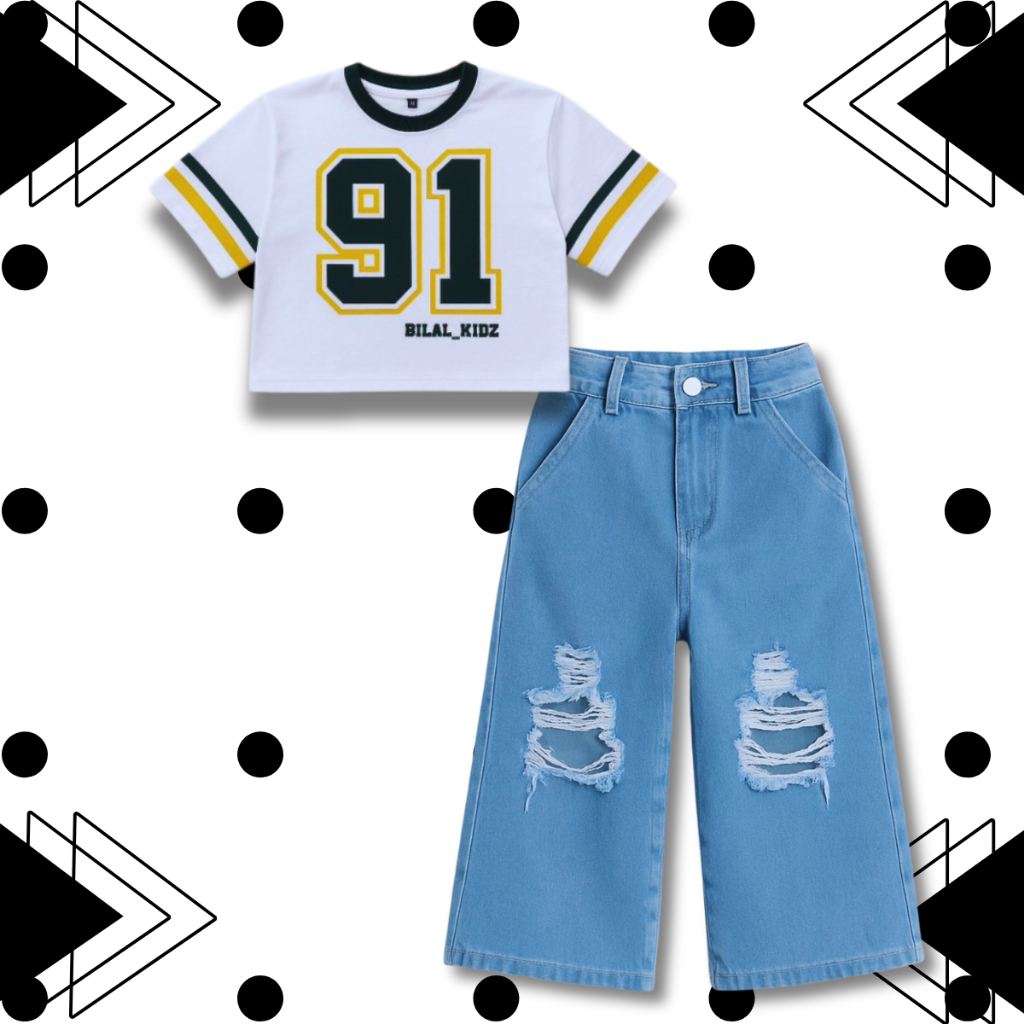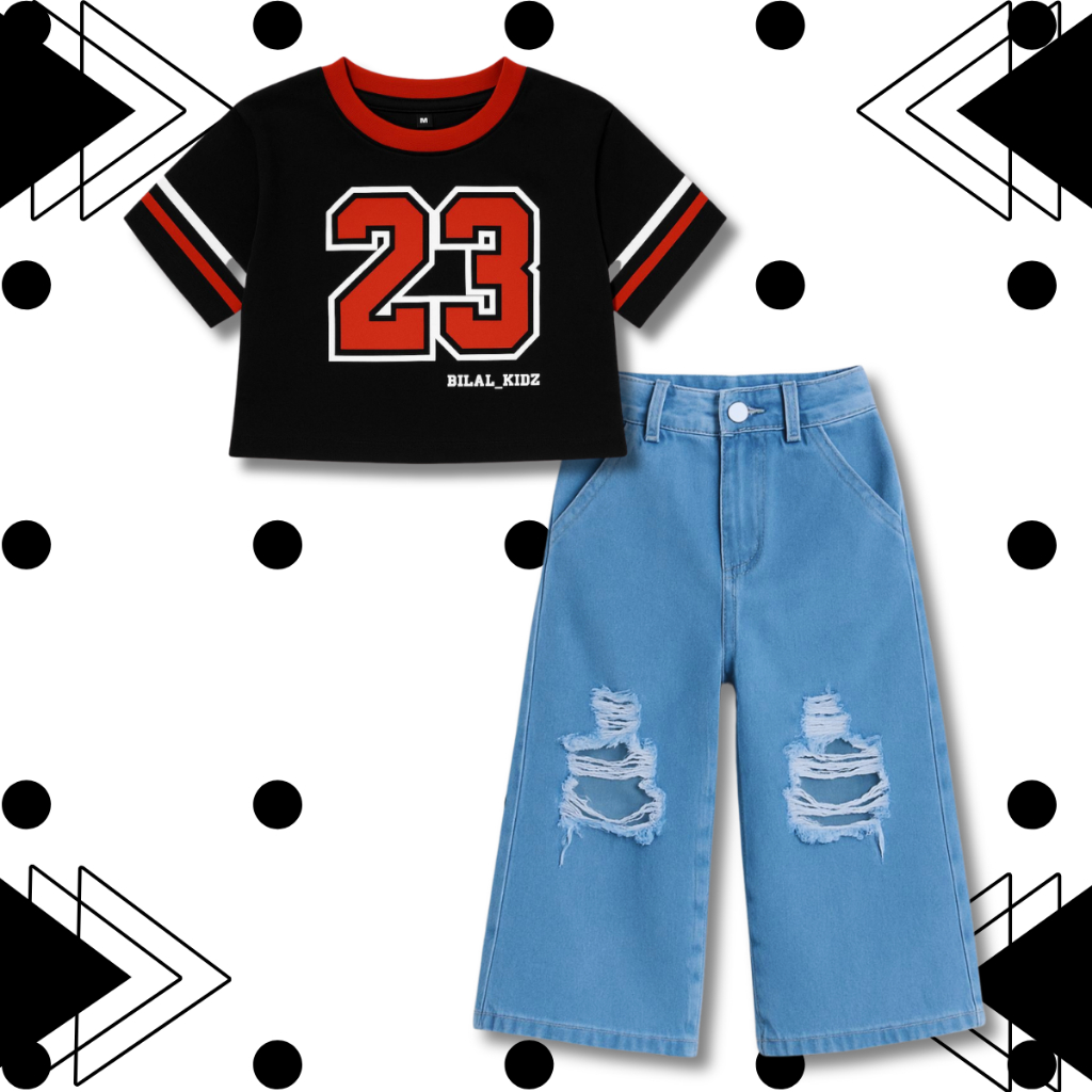 SETELAN ANAK KEKINIAN KULOT SOBEK DENIM DAN KAOS CROP ANAK PEREMPUAN USIA 1-10 TAHUN