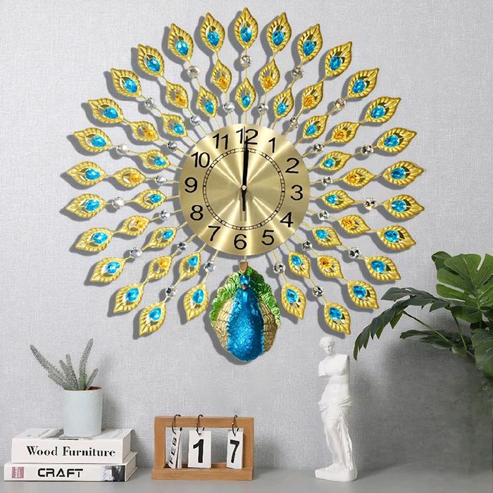 Jam Dinding Jam Dinding Hias Mewah 60 cm Desain Merak Berlian, Silent Quartz Movement (Gold)