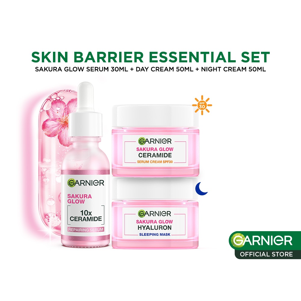 GARNIER Paket Skincare 1 Set Lengkap Sakura Glow Ceramide Skin Barrier Set Serum & CreamDay Cream 50 ml + Night BPOM