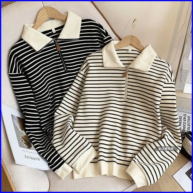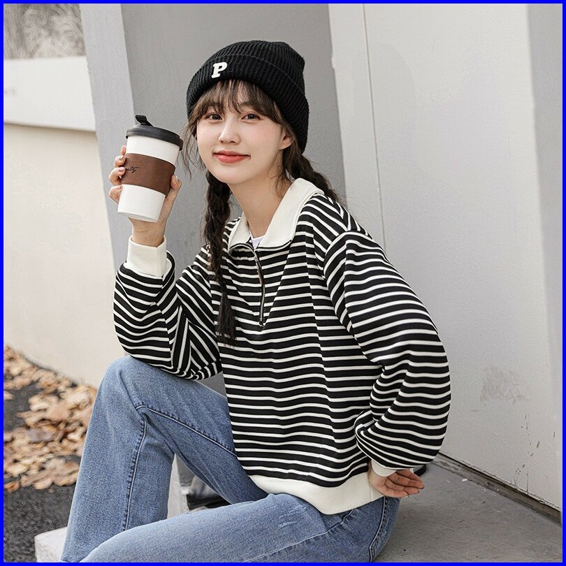 Brasay Knitwear Kaos Sweater Kerah Wanita Lengan Panjang Zip Rajut Sreetwear Garis Sweater Wanita Premium 4130