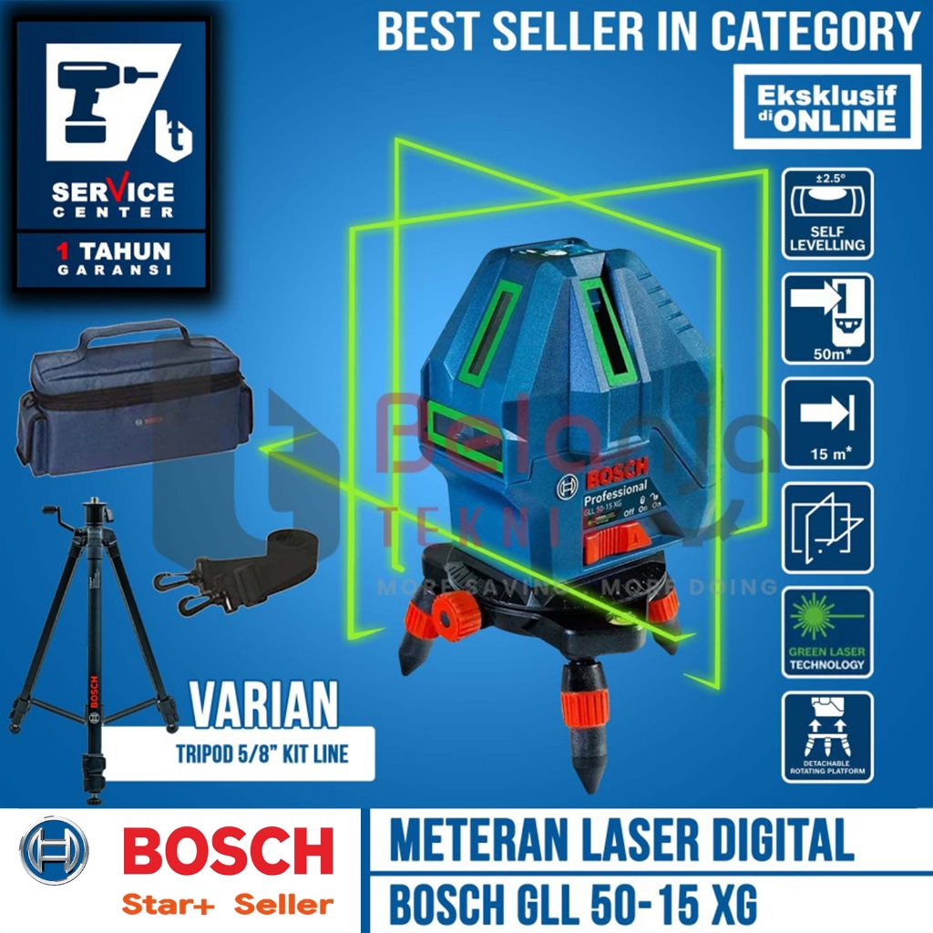 Meteran Laser Garis BOSCH GLL 50-15 XG + Tripod 5/8 Inch Kit Line Level Green Laser GLL50-15 GLL50-15XG