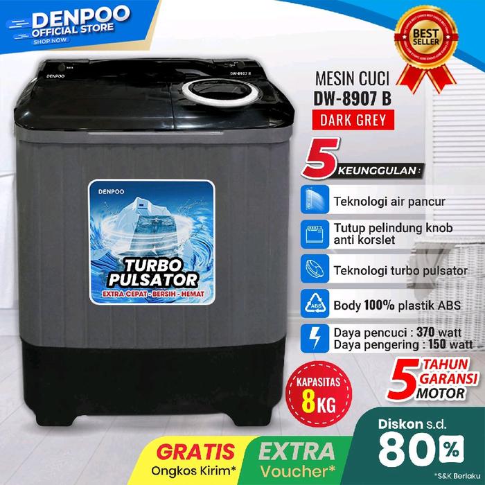 DENPOO MESIN CUCI DW 8907 TURBO FULSTOR 8KG 2 TABUNG