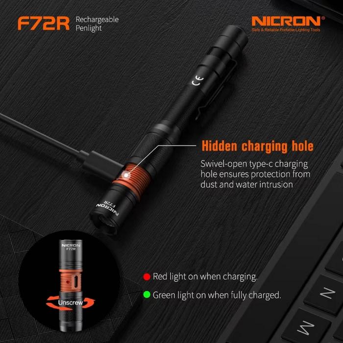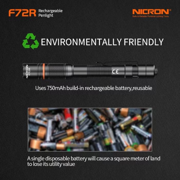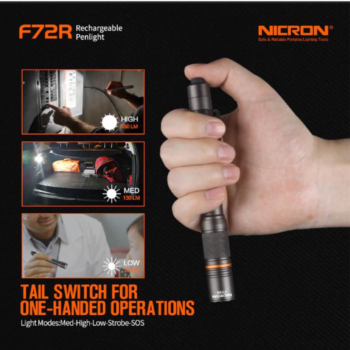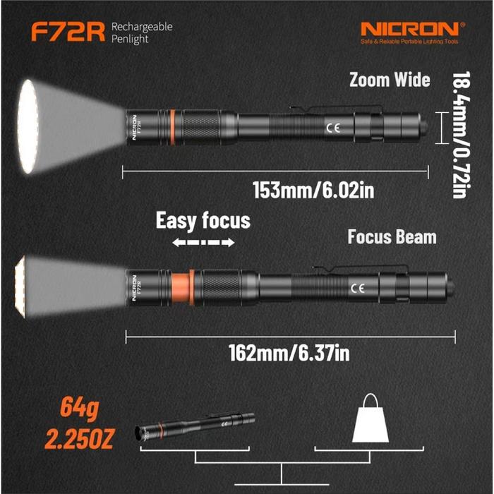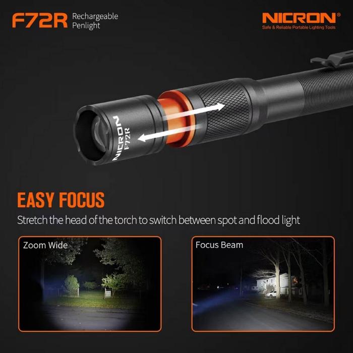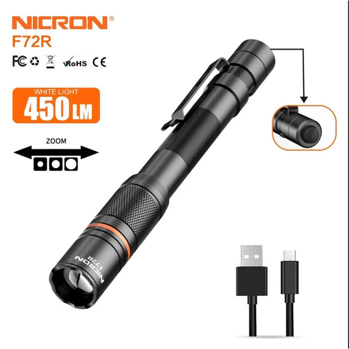 Nicron Senter Penlight F72R Easy Focus - Tingkat Cahaya 450 lumen, Jarak Cahaya 125 meter - Water
