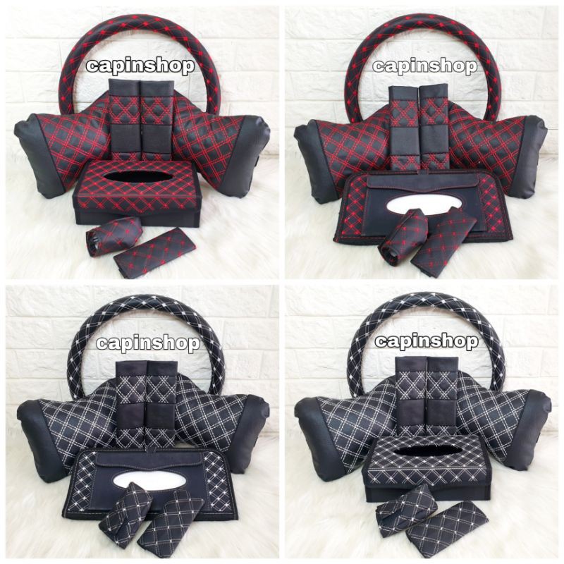 Aksesoris set Bantal Setir CD tisu Mobil Kulit Bordir Benang