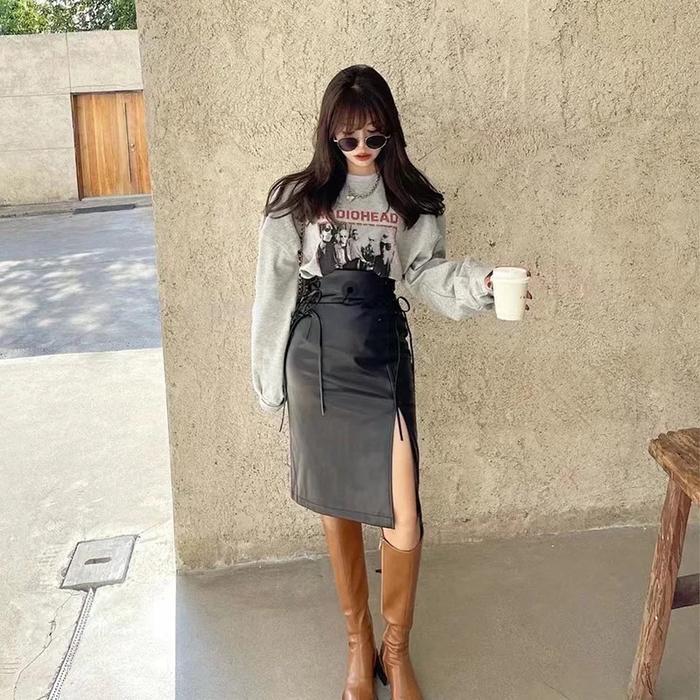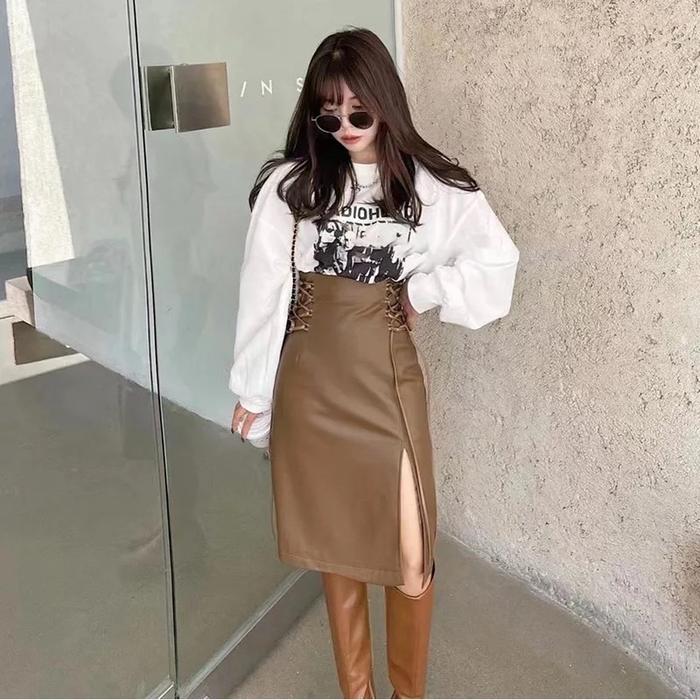 Rok Wanita/Baju Kemeja Wanita Riseleather.id Rok Kulit Wanita Midi High Waist Pinggang tali Belah