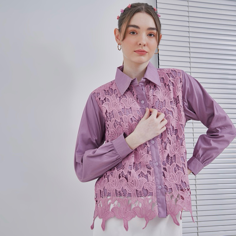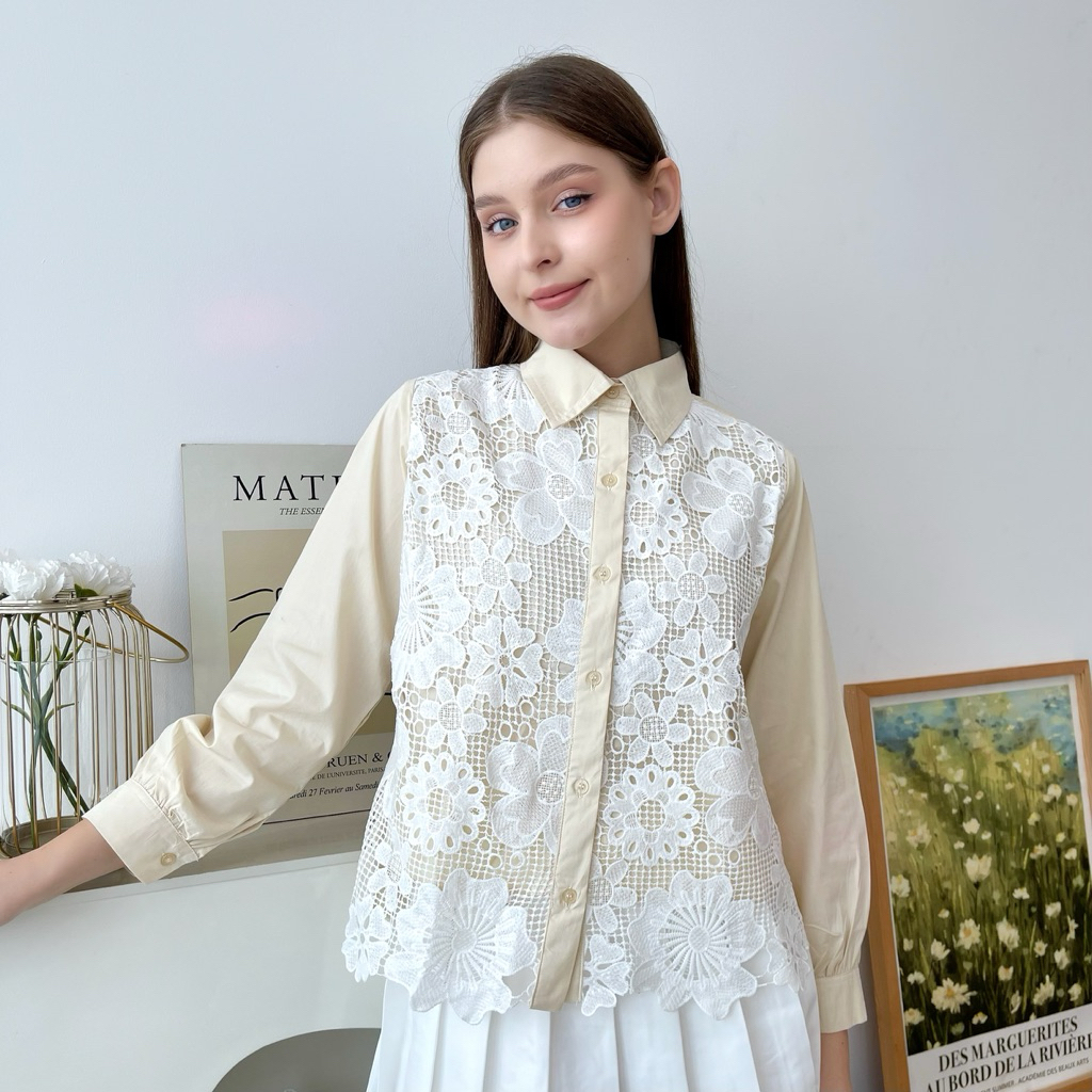 [ Senchi ] - Sumiko Brocade Lace Shirt / Atasan Kemeja Brokat Brukat / Atasan Kemeja Renda Wanita / Kemeja Katun Kombinasi Brokat