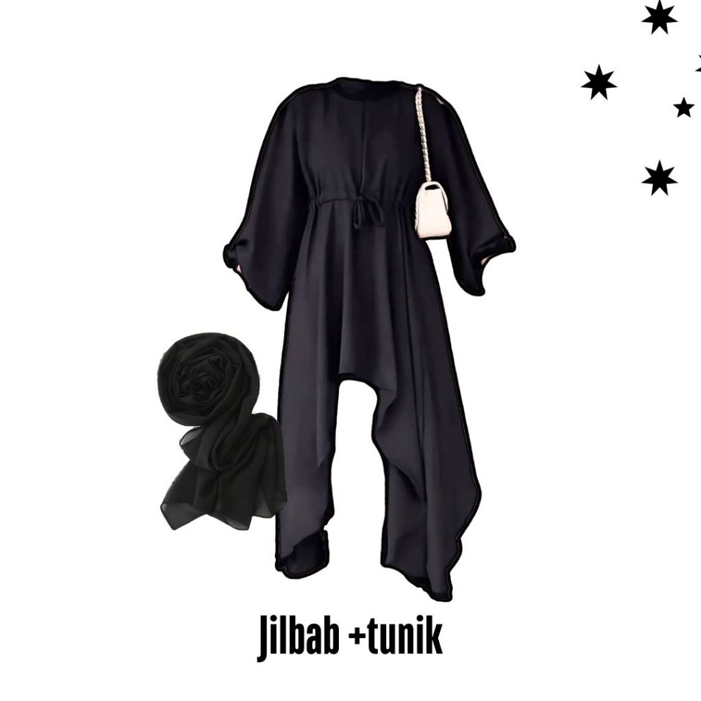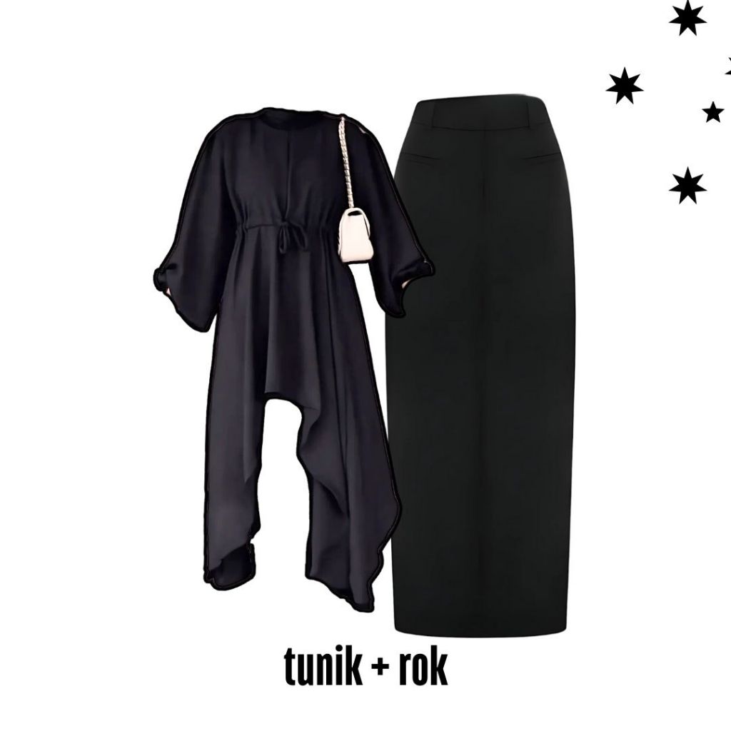 Oneset 3in1 tunik hitam rok span jilbab bella square | ootd outfit main hanut kondangan kuliah kampus kerja keluarga res