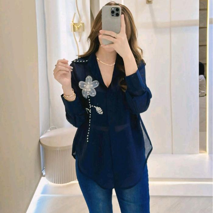 Baju Kemeja Wanita/Rok Wanita Kemeja Camelia Flower Payet Mutiara Lengan Panjang Wanita Dewasa