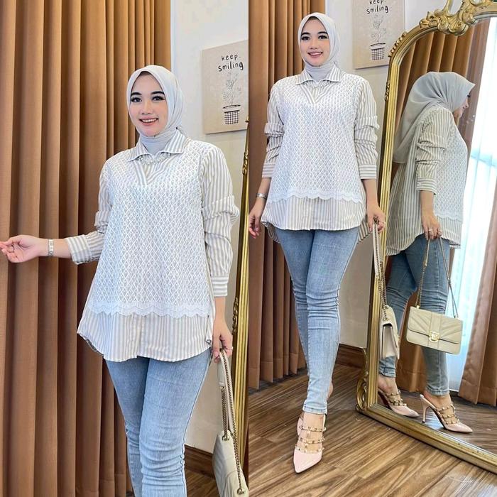 Baju Kemeja Wanita/Rok Wanita Kemeja Sassy salur combi brukat lengan panjang busui friendly Katun
