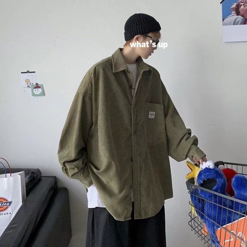 DARK ICON CORDUROY KEMEJA PRIA LENGAN PANJANG PLAIN OVERSIZE SHIRTS MEN KOREAN OUTERWEAR 90S OUTFIT BAJU PRIA HIJAU / ABU-AB/HITAM