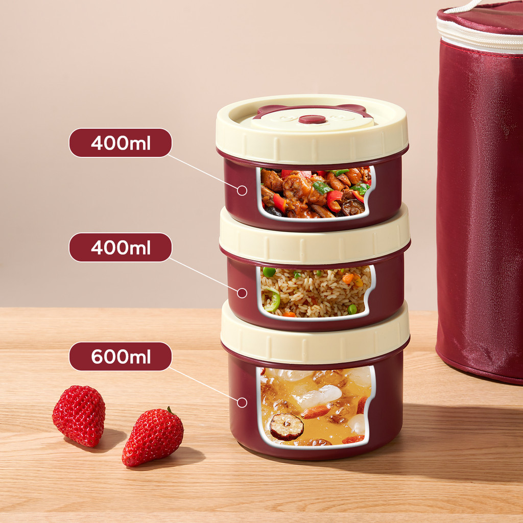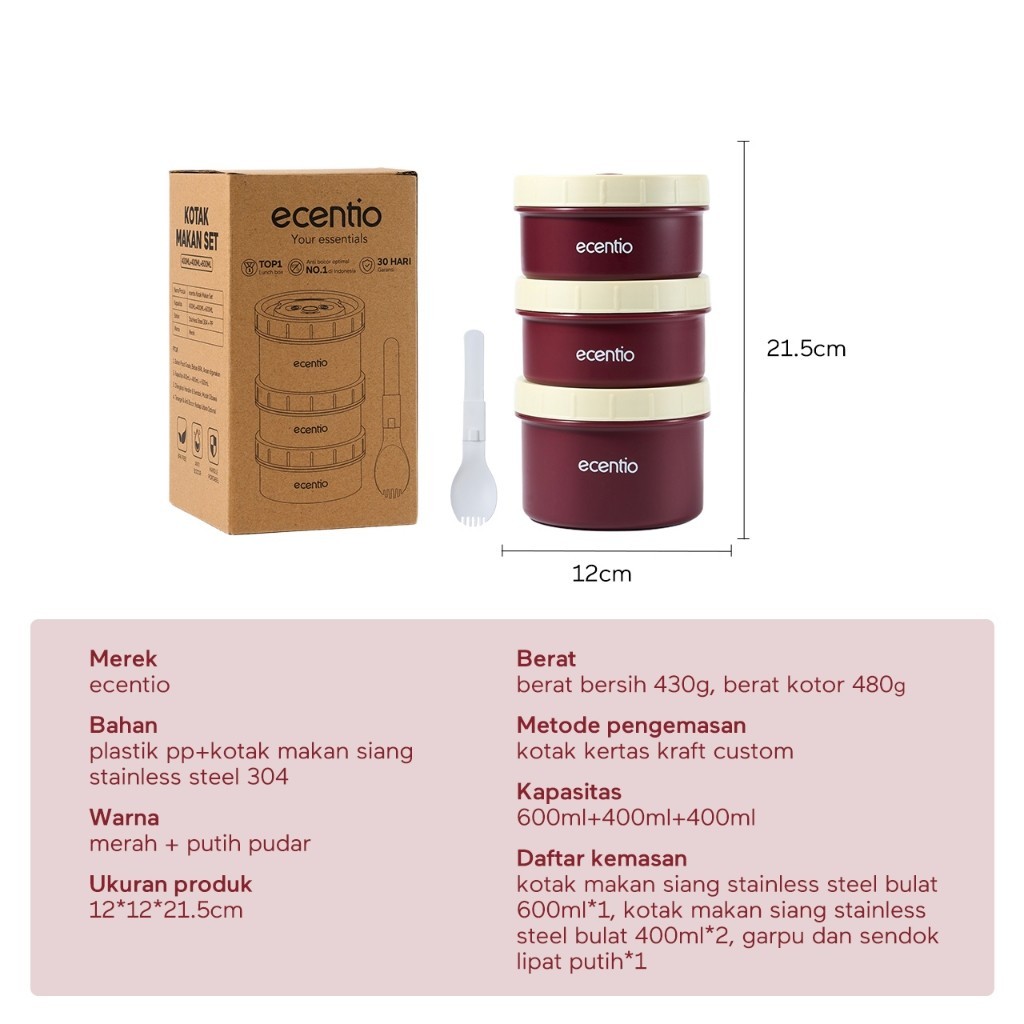 Ecentio Lunch Box Set 3Pcs Merah Kotak Makan Anti Tumpah 304 Stainless Steel Tempat Bekal