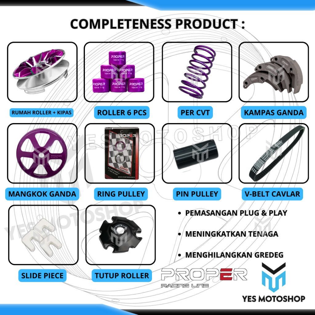 PAKET UPGRADE CVT PROPER RACING LINE NMAX AEROX LEXI PULLEY SET MANGKOK KAMPAS GANDA ROLLER PER CVT