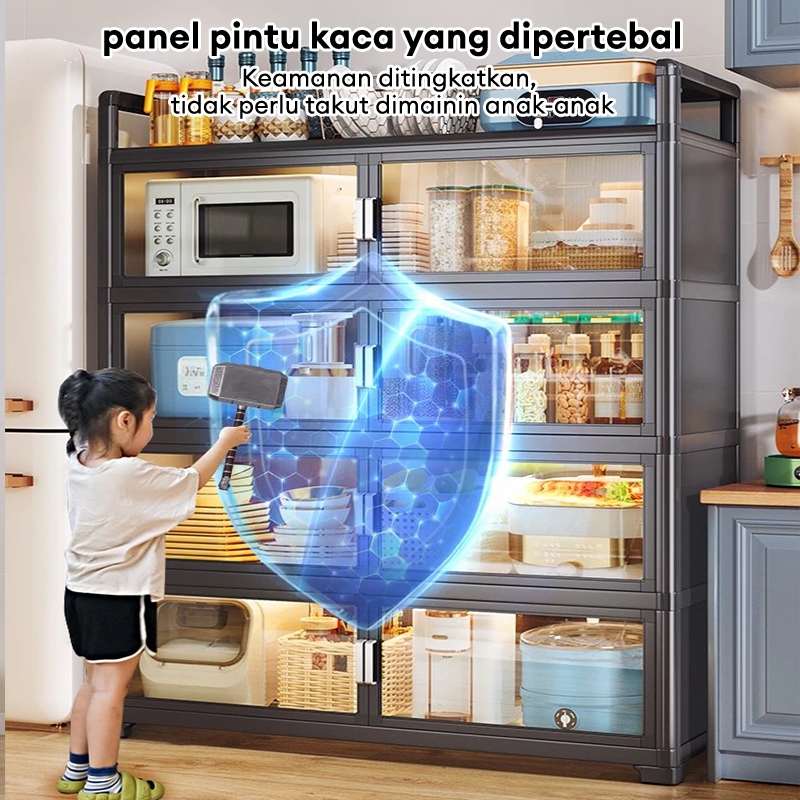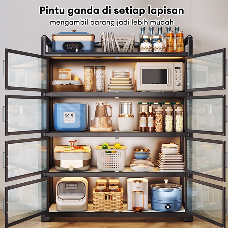Rak Lemari Dapur stainless steel Lemari dapur serbaguna Lemari rak piring tertutup Rak Oven Microwave Rak Kabinet Dapur Dengan Roda Dengan Pintu